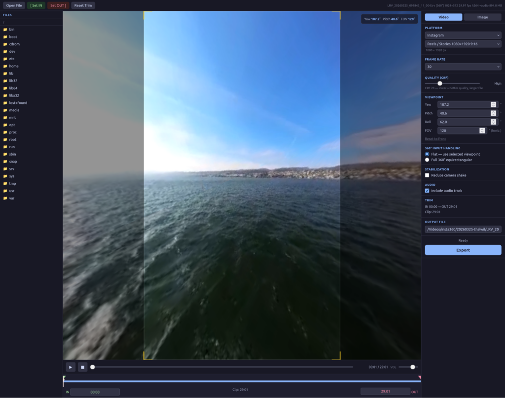 Das Export-Werkzeug übernimmt all das automatisch. Der Nutzer wählt eine Zielplattform – YouTube, Instagram, TikTok oder einen allgemeinen Download –, und das Werkzeug wendet die korrekte Projektion, das richtige Seitenverhältnis, die passenden Bitraten-, Codec-Einstellungen und Metadaten an. Für YouTube wird die vollständige equirectangulare Ausgabe mit eingebetteten 360-Grad-Metadaten erzeugt. Für Instagram und TikTok wird ein geradliniger Ausschnitt aus einer konfigurierbaren Blickrichtung berechnet, mit Seitenverhältnis und Auflösung entsprechend den Plattformvorgaben. Das stabilisierte Footage wird als Quelle für alle Exporte verwendet, sodass verwackeltes Quellmaterial nicht in die veröffentlichte Ausgabe übernommen wird.